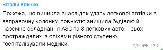 Телеграм-каналы выяснили, что на АЗС сгорело по меньшей мере пять автомобилей. Однако позже Кличко уточнил, что пожар возник вследствие удара легкового автомобиля в заправочную колонку и полностью уничтожил здание, наземное оборудование АЗС и восемь легковых автомобилей.