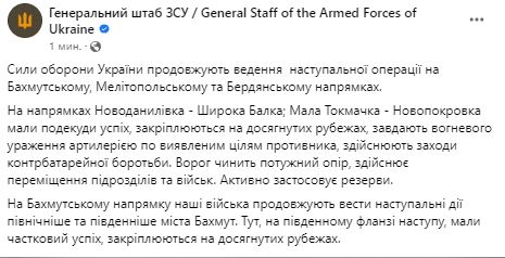 Силы обороны Украины продолжают вести наступательную операцию на Бахмутском, Мелитопольском и Бердянском направлениях.