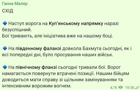 Также она сообщает, что на "южном фаланге возле Бахмута сегодня, как и все предыдущие дни, было продвижение наших войск".