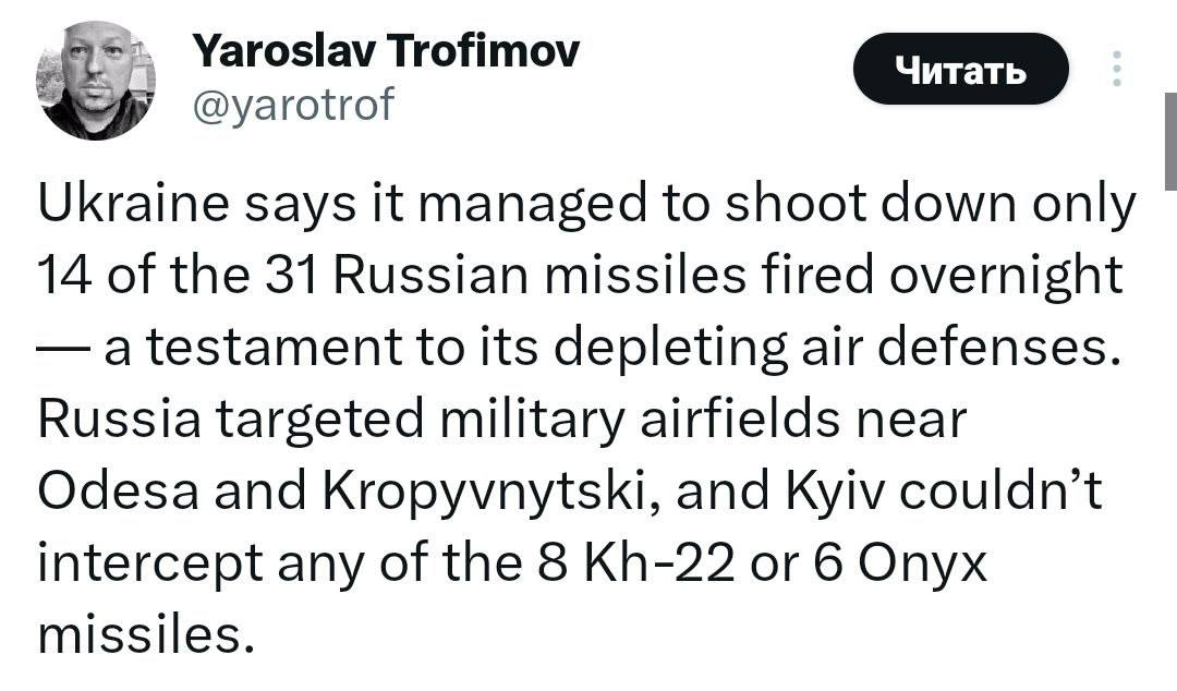 "Украина заявляет, что ей удалось сбить только 14 из 31 российской ракеты, выпущенной за ночь, что свидетельствует об истощении ее ПВО", - пишет журналист The Wall Street Journal Ярослав Трофимов в Twitter.