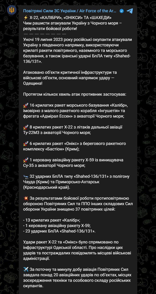 Отметим, что, согласно информации Воздушных сил ВСУ, во время воздушной атаки этой ночью не были сбиты такие вражеские цели: