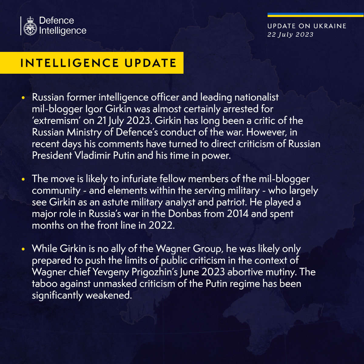 "Гиркин долгое время был критиком ведения войны Министерством обороны России. Однако в последние дни его комментарии превратились в прямую критику президента России Владимира Путина и его пребывания у власти", - говорится в сообщении.
