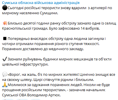 "Враг, к сожалению, бьет по мирным жителям! Цинически уничтожает все на своем пути. Искренние соболезнования родным и близким. Молимся за выздоровление раненых людей. Никогда не будет прощения российским террористам", – отметил глава Сумской ОВА Владимир Артюх.