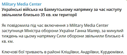 Украинские войска на южном фронте за время наступления освободили более 192 кв. км территории, а на Бахмутском направлении - около 35 кв. км территории.