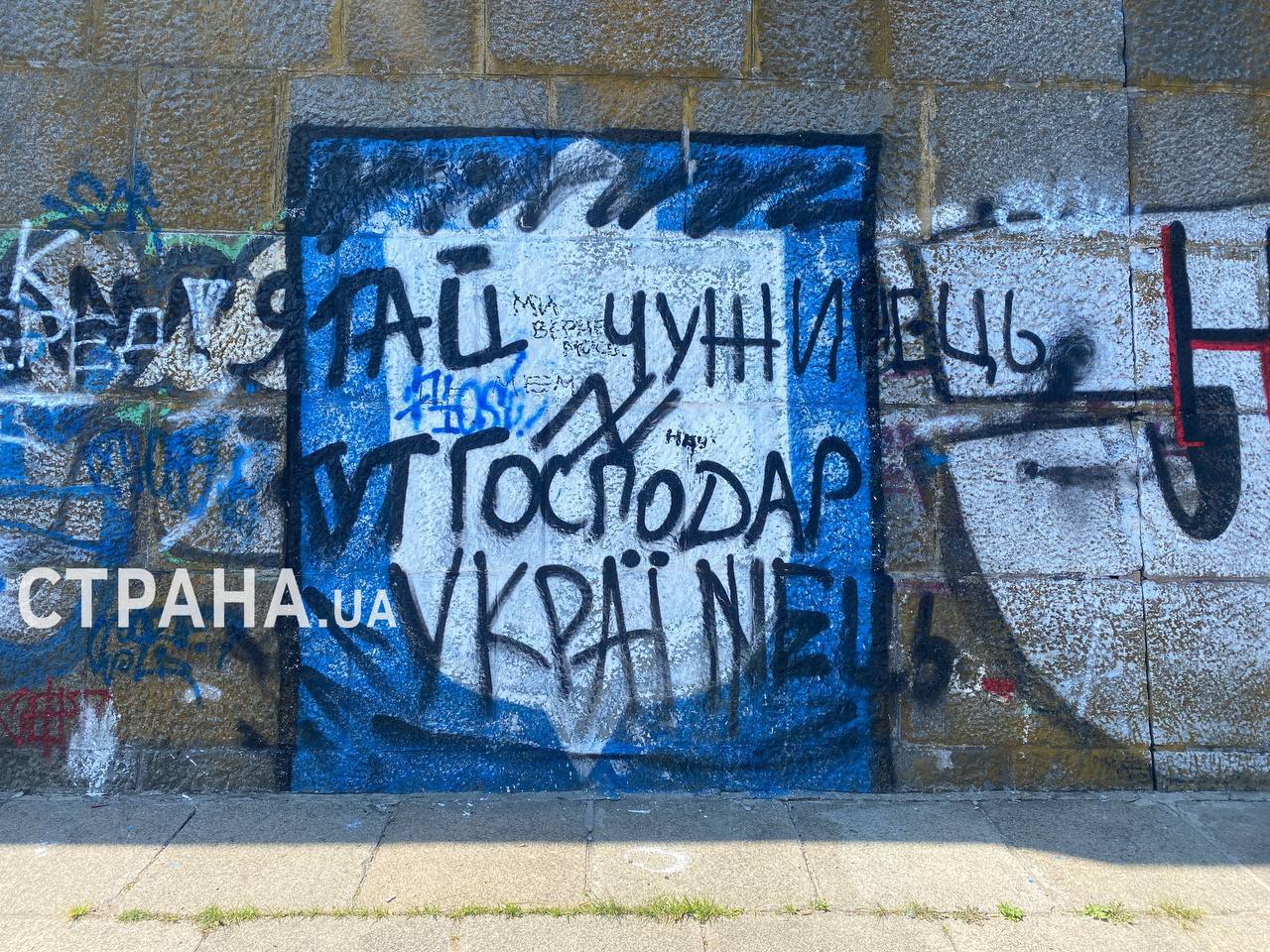 Но через некоторое время ее кто-то замазал и написал: "Пам'ятай, чужинець, тут господар - українець".