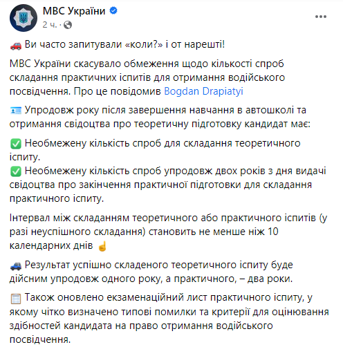 Украинцы смогут сдавать экзамены для получения водительского удостоверения неограниченное количество раз. Ранее желающим получить права давали только три попытки.