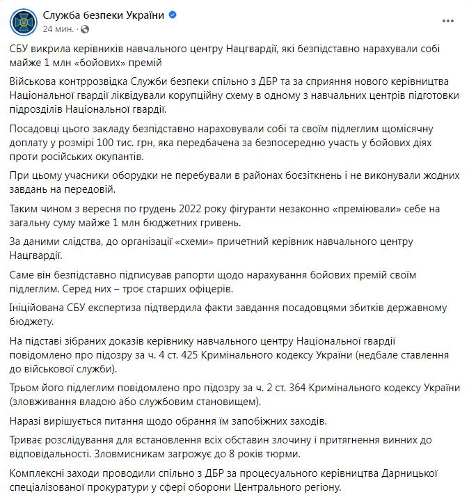 На основании собранных доказательств руководителя учебного центра Нацгвардии поставили в известность о подозрении по ч. 4 ст. 425 Уголовного кодекса Украины (небрежное отношение к военной службе). Трем его подчиненным сообщено о подозрении по ч. 2 ст. 364 Уголовного кодекса Украины (злоупотребление властью или служебным положением). В настоящее время решается вопрос об избрании им меры пресечения.