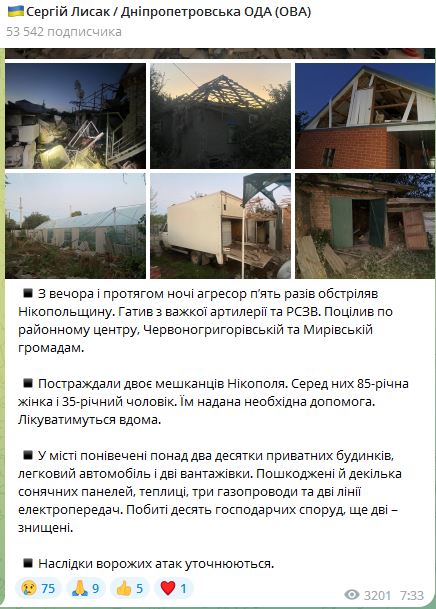 Пострадали двое жителей Никополя. Среди них 85-летняя женщина и 35-летний мужчина. Им оказана необходимая помощь. Будут лечиться дома.