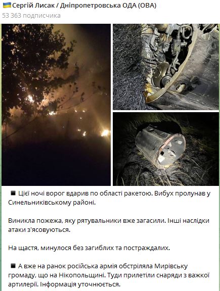 07.31 Ночью был ракетный удар по Днепропетровской области. Ракета упала в Синельниковском районе, где возник пожар.