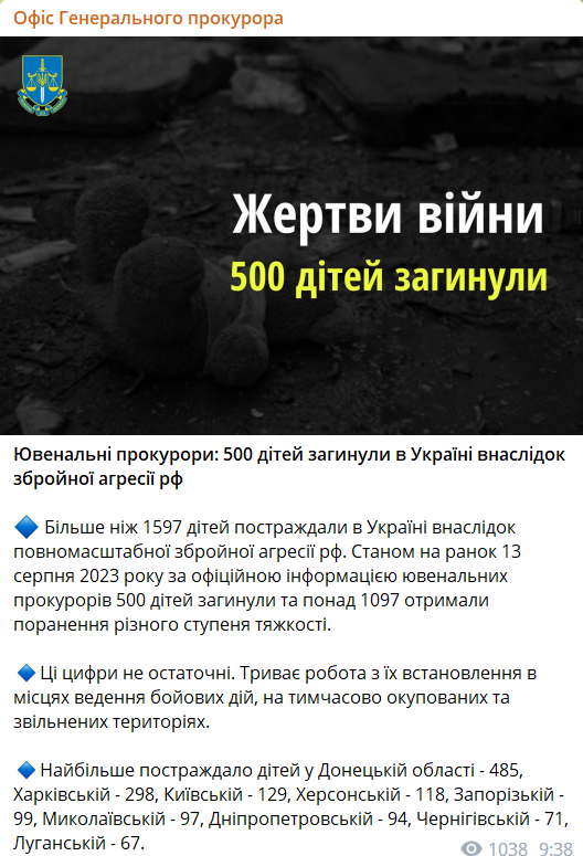 В Украине 500 детей погибли в результате вооруженной агрессии РФ - Офис генпрокурора