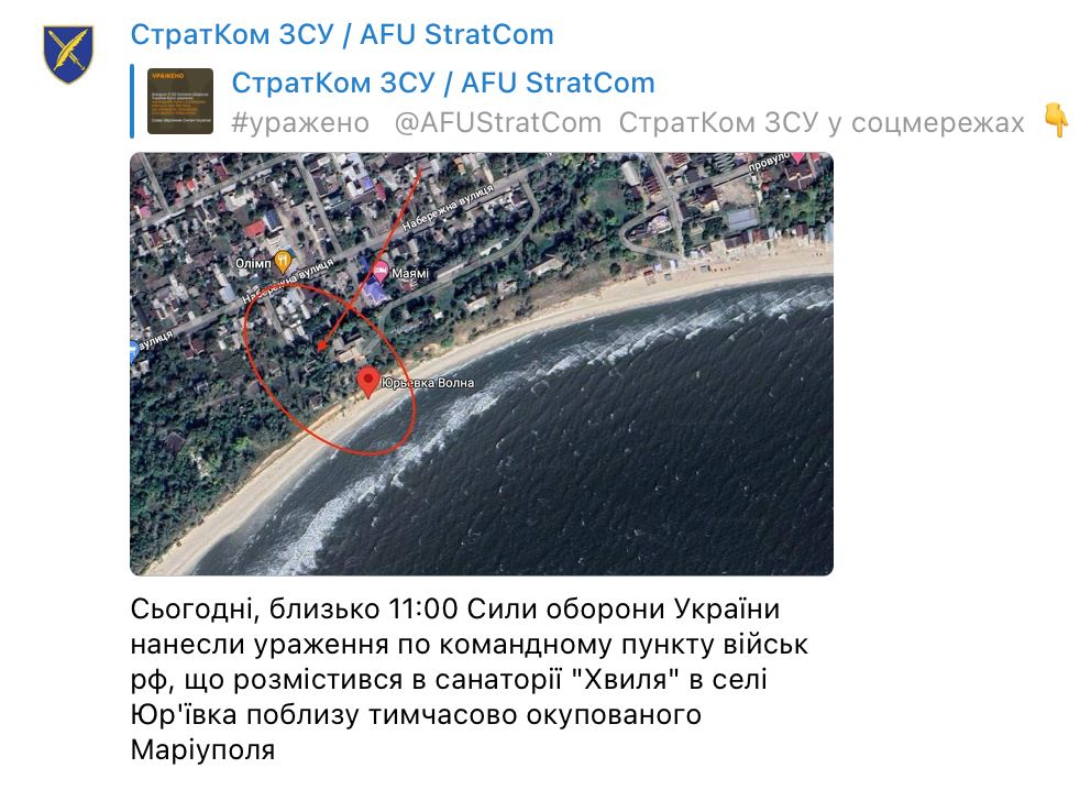 Вскоре в ВСУ подтвердили удар по Юрьевке. Стратком заявил, что был поражен командный пункт войск РФ в санатории "Волна".