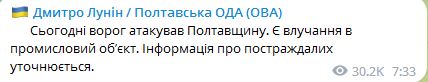 "Сегодня враг атаковал Полтавщину. Есть попадание в промышленный объект. Информация о пострадавших уточняется" - написал глава Полтавской области.