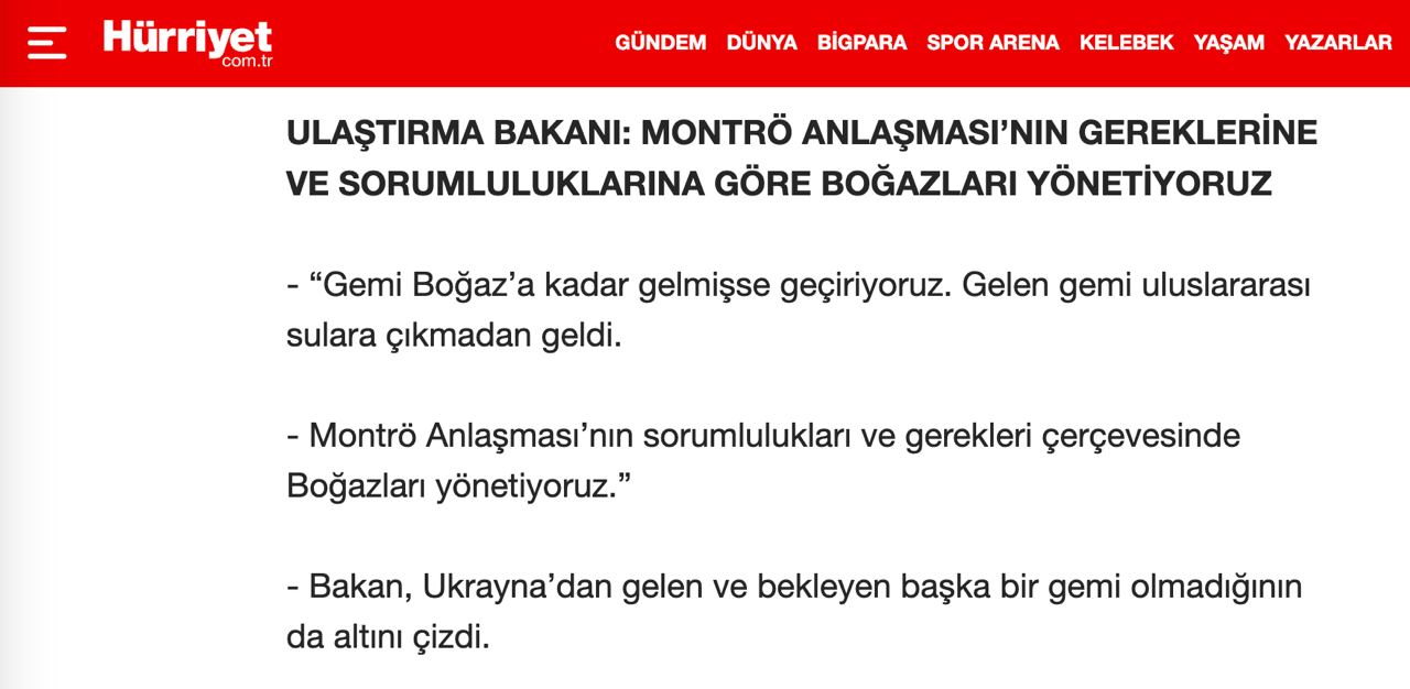 Однако добавил, что если какое-то судно достигнет Босфора, как это сделал контейнеровоз Joseph Schulte под флагом Гонконга, то его пропустят.