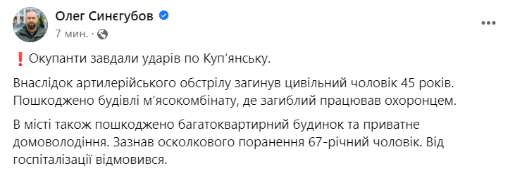 "Оккупанты нанесли удары по Купянску. В результате артиллерийского обстрела погиб гражданский мужчина 45 лет. Повреждены здания мясокомбината, где погибший работал охранником", - написал он.