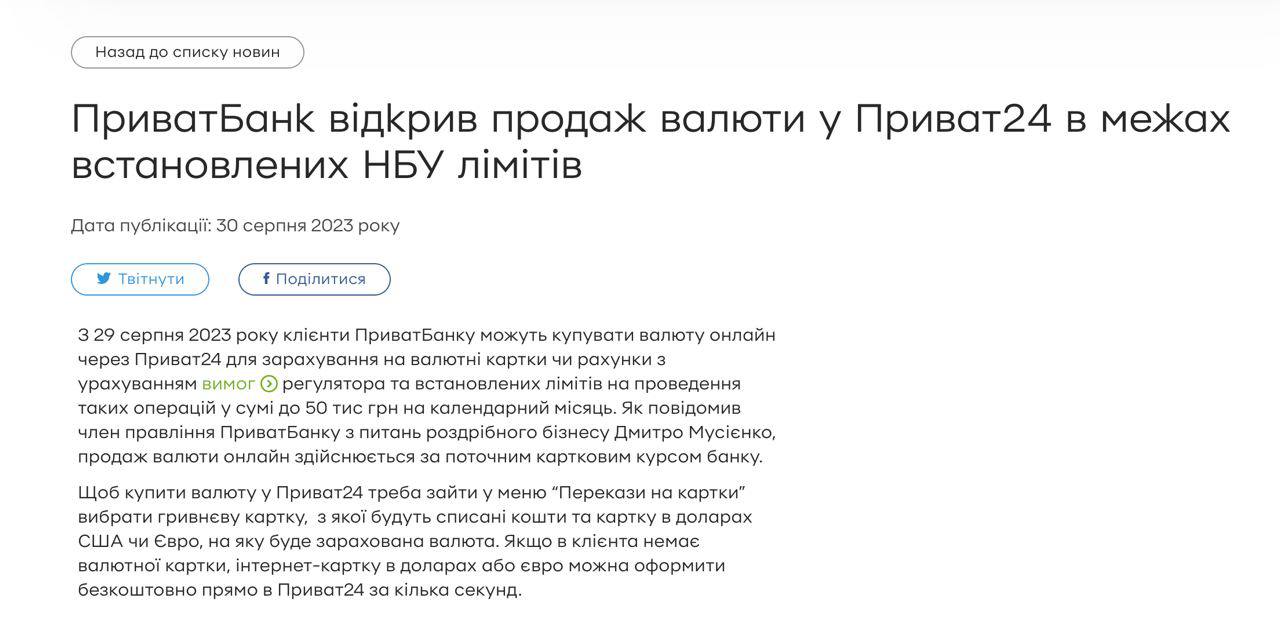 "С 29 августа 2023 г. клиенты "ПриватБанка" могут покупать валюту онлайн через "Приват24" для зачисления на валютные карты или счета с учетом требований регулятора и установленных лимитов на проведение таких операций в сумме до 50 тысяч гривен в календарный месяц. Как сообщил член правления "ПриватБанка" по розничному бизнесу Дмитрий Мусиенко, продажа валюты онлайн осуществляется по текущему карточному курсу банка", - сказано в пресс-релизе.