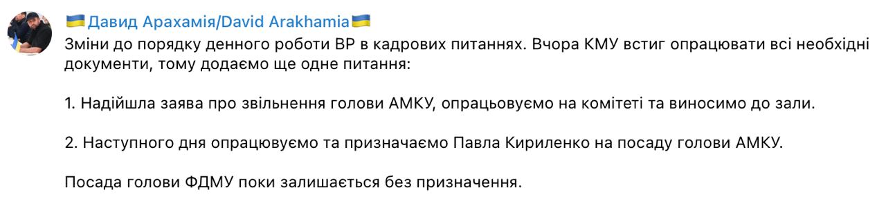 09:41 Давид Арахамия подтвердил информацию, что новым главой АМКУ хотят назначить донецкого губернатора Павла Кириленко.
