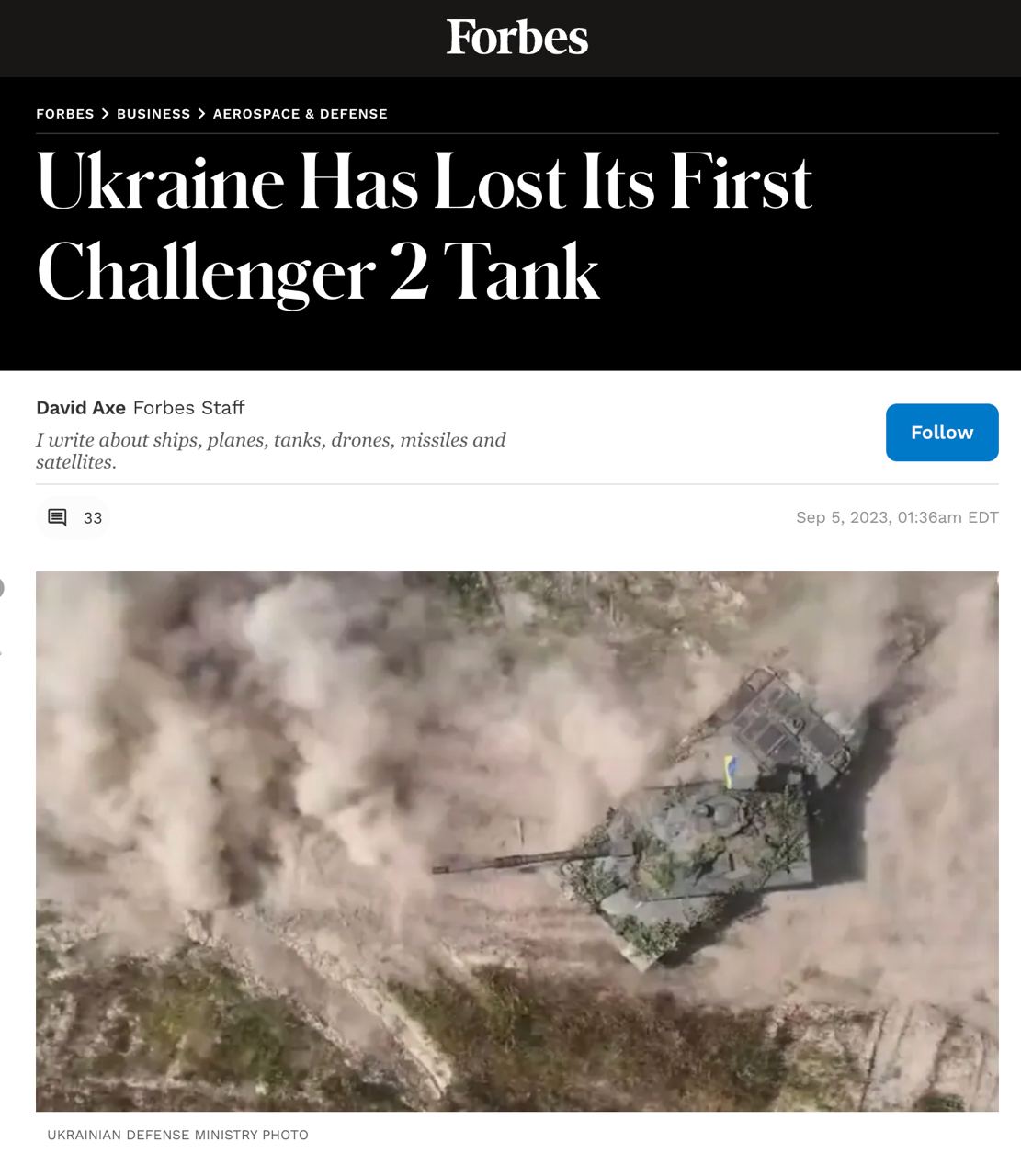 Американский финансово-экономический журнал Forbes подтвердил потерю Украиной первого танка "Челленджер-2" (Challenger 2), о чем ранее писали российские телегам-каналы.