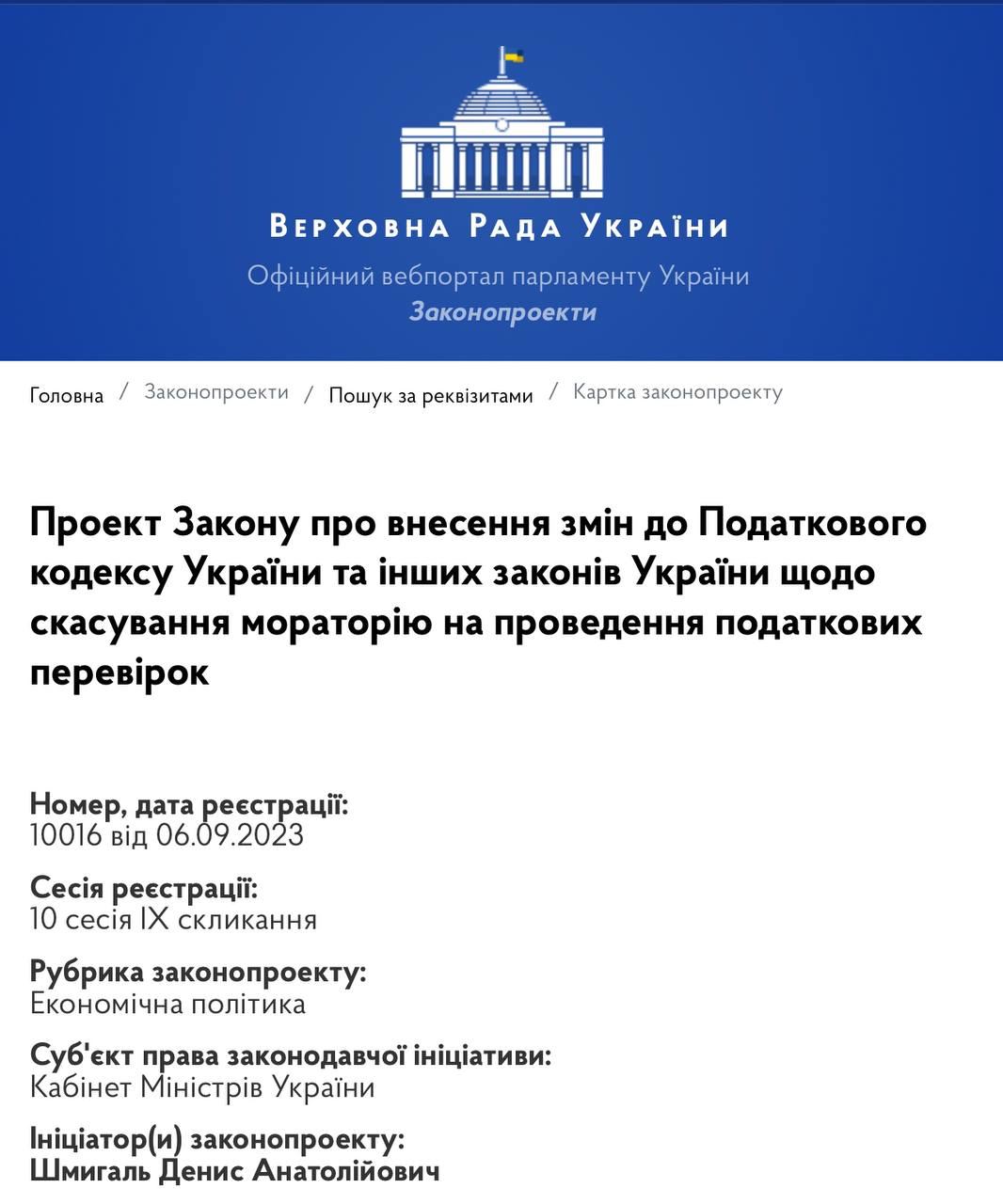 "Законопроект направлен на выполнение Украиной в полном объеме обязательств в рамках Меморандума об экономической и финансовой политике от 8 декабря 2022 года в части ограничения действия моратория на проведение налоговых проверок", - сообщил представитель правительства в парламенте Тарас Мельничук.