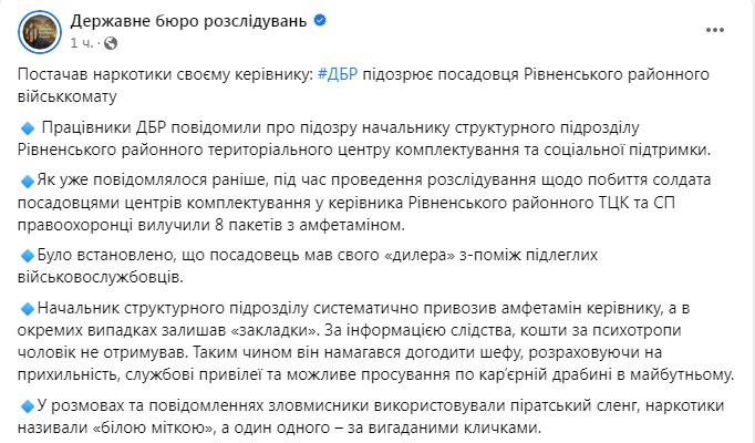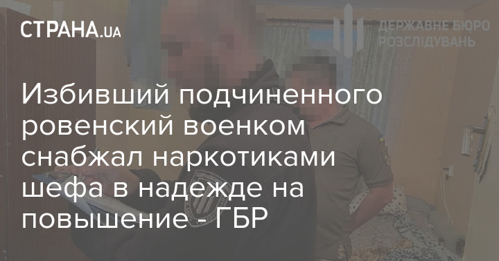 В Украине получила продолжение история руководителя подразделения Ровенского районного военкомата, который избил подчиненного. Сотрудники ГБР сообщили ему о подозрении за систематические поставки своему начальству наркотиков.
