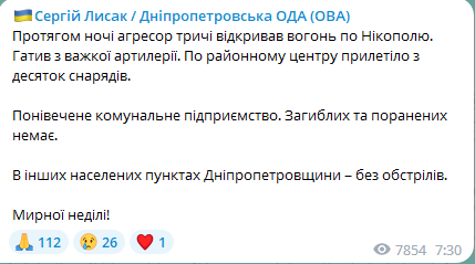 "В течение ночи агрессор трижды открывал огонь по Никополю. Стрелял из тяжелой артиллерии. По районному центру прилетело с десяток снарядов. Повреждено коммунальное предприятие", - написал Лысак.
