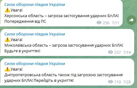 07.20 С утра в Херсонской, Николаевской, Днепропетровской области угроза атаки беспилотников.