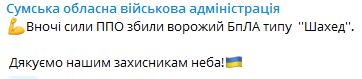 07.35 Ночью в Сумской области силы ПВО сбили вражеский беспилотик.