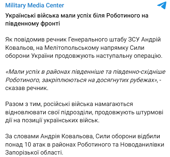Спикер Генштаба Андрей Ковалев заявил, что украинские войска имеют успех в районе Работино на мелитопольском направлении.