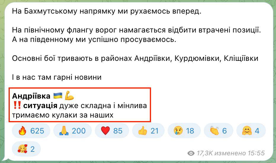 16.04 ВСУ освободили Андреевку - село на южном фланге Бахмута около Клещеевки, сообщила Анна Маляр.