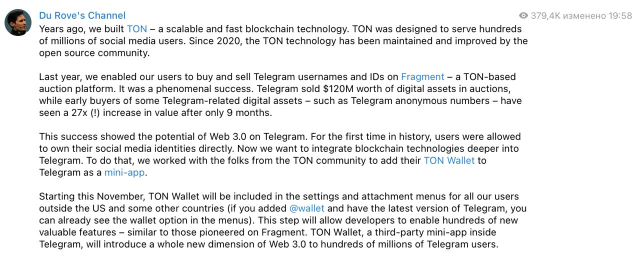 Ранее Telegram запустил возможность покупать и продавать имена пользователей и идентификаторы Telegram на Fragment — аукционной платформе на базе TON.