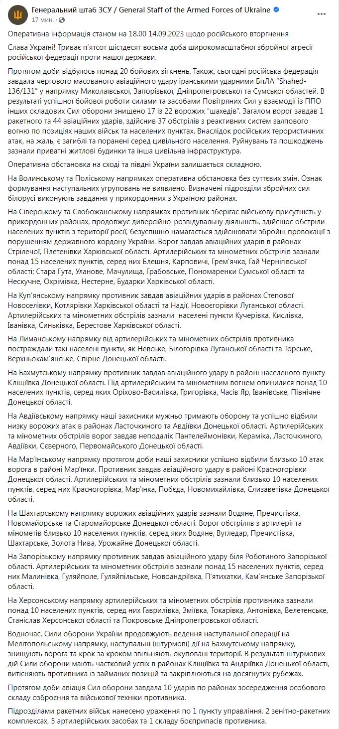 Генштаб ВСУ опубликовал оперативную информацию о российском вторжении по состоянию на 18:00 14 сентября.