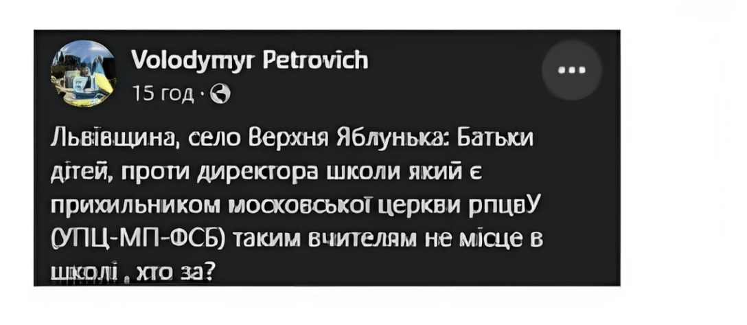 "Львовская область, село Верхняя Яблонька. Родители детей против директора школы, который является сторонником московской церкви УПЦ-МП-ФСБ. Таким учителям не место в школе, кто за?" - сказано в посте.