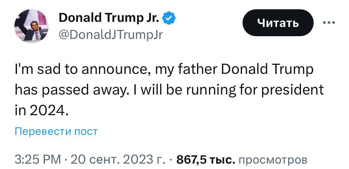 "С грустью сообщаю, что мой отец Дональд Трамп скончался. Я буду баллотироваться в президенты в 2024 году", - говорилось в посте. Впрочем, вскоре после взлома он был удален.