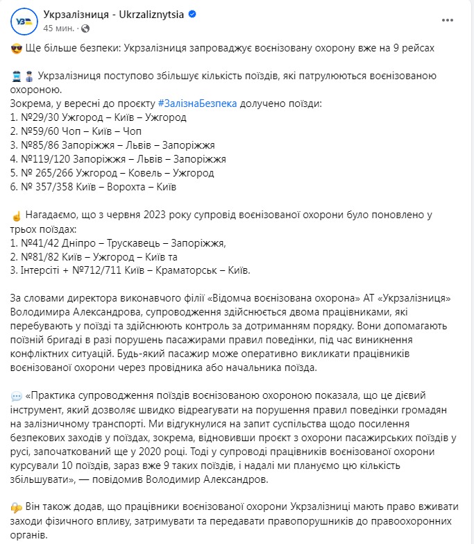 По словам директора исполнительного филиала "Ведомственная военизированная охрана" АО "Укрзализныця" Владимира Александрова, охрана контролирует соблюдение порядка, помогает поездной бригаде в случаях нарушений пассажирами правил поведения при возникновении конфликтных ситуаций. Любой пассажир может оперативно вызвать работников военизированной охраны через проводника или начальника поезда.