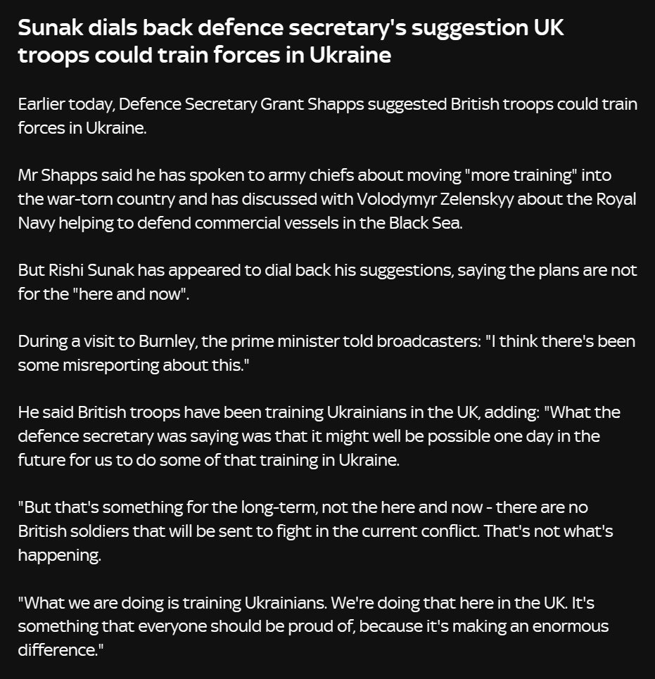 "Министр обороны имел в виду, что однажды в будущем вполне возможно, что мы проведем часть этого обучения в Украине. Но это на долгосрочную перспективу, а не здесь и сейчас - нет британских солдат, которые будут отправлены сражаться в нынешнем конфликте", - заявил премьер.