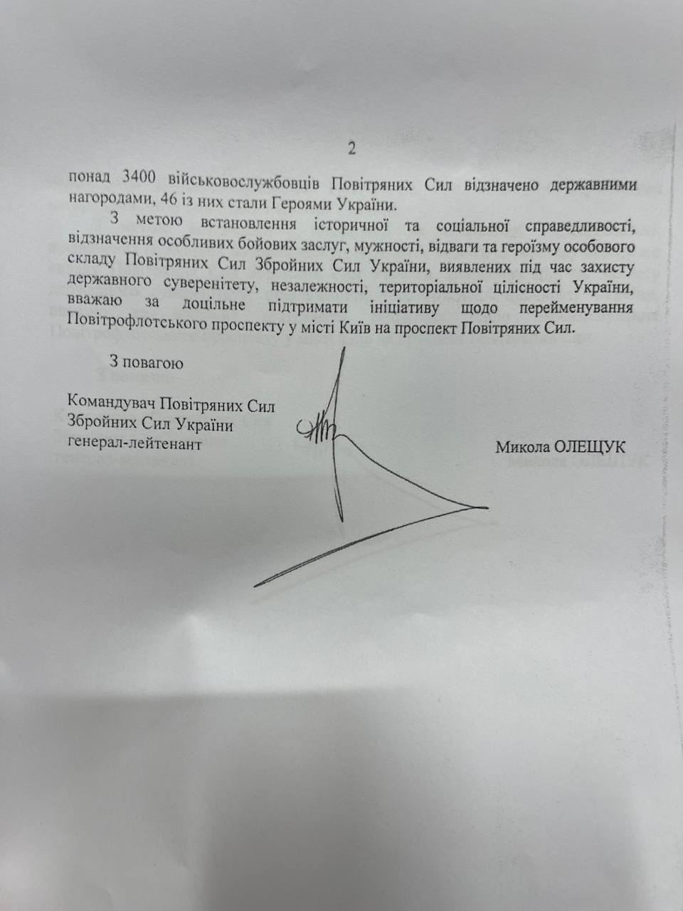 Командование Воздушных сил предлагает переименовать Воздухофлотский проспект в Киеве на проспект Воздушных сил.