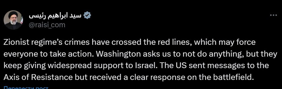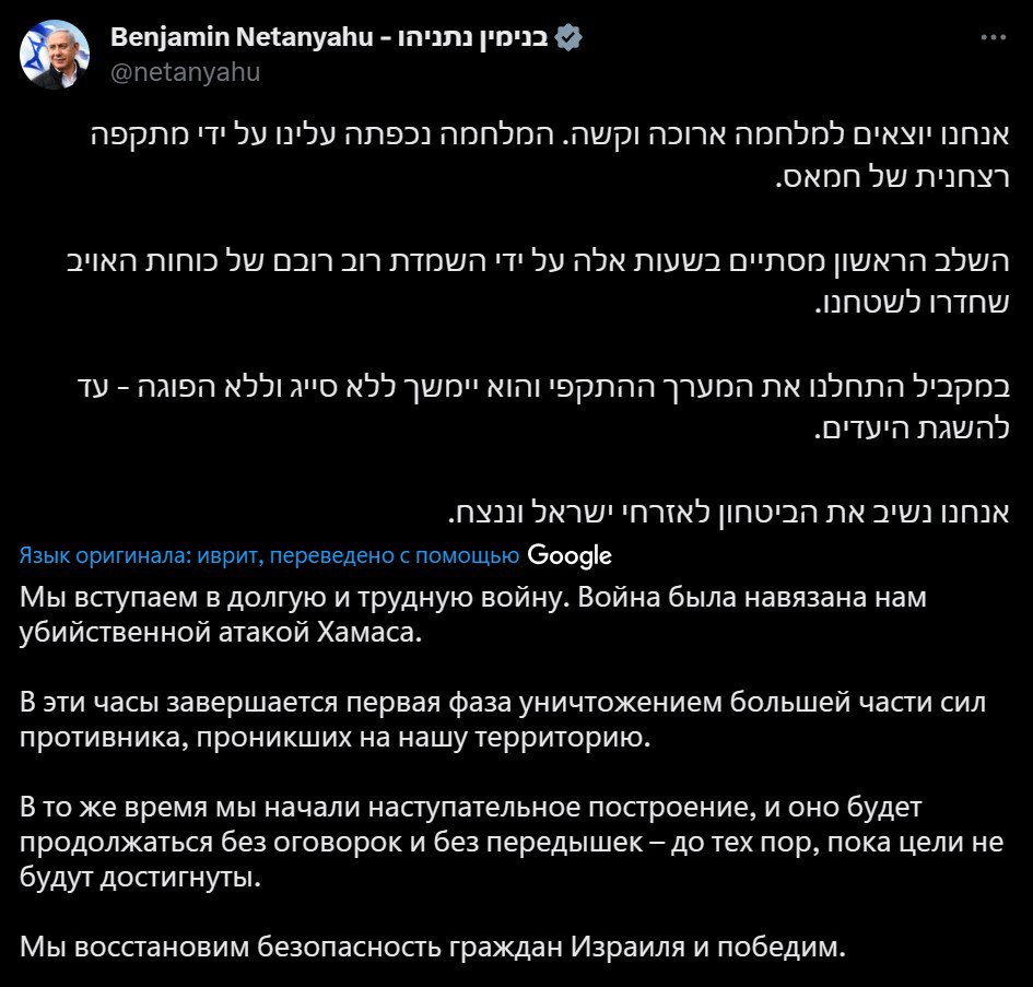 12.25 Премьер-министр Израиля Нетаньяху заявил, что Израиль находится в состоянии "войны", а не в формате операции, пообещал, что противник "заплатит цену".