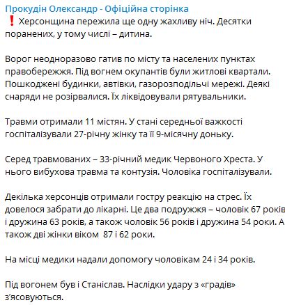 Травмы получили 11 жителей Херсона. В состоянии средней тяжести госпитализировали 27-летнюю женщину и ее 9-месячную дочь.