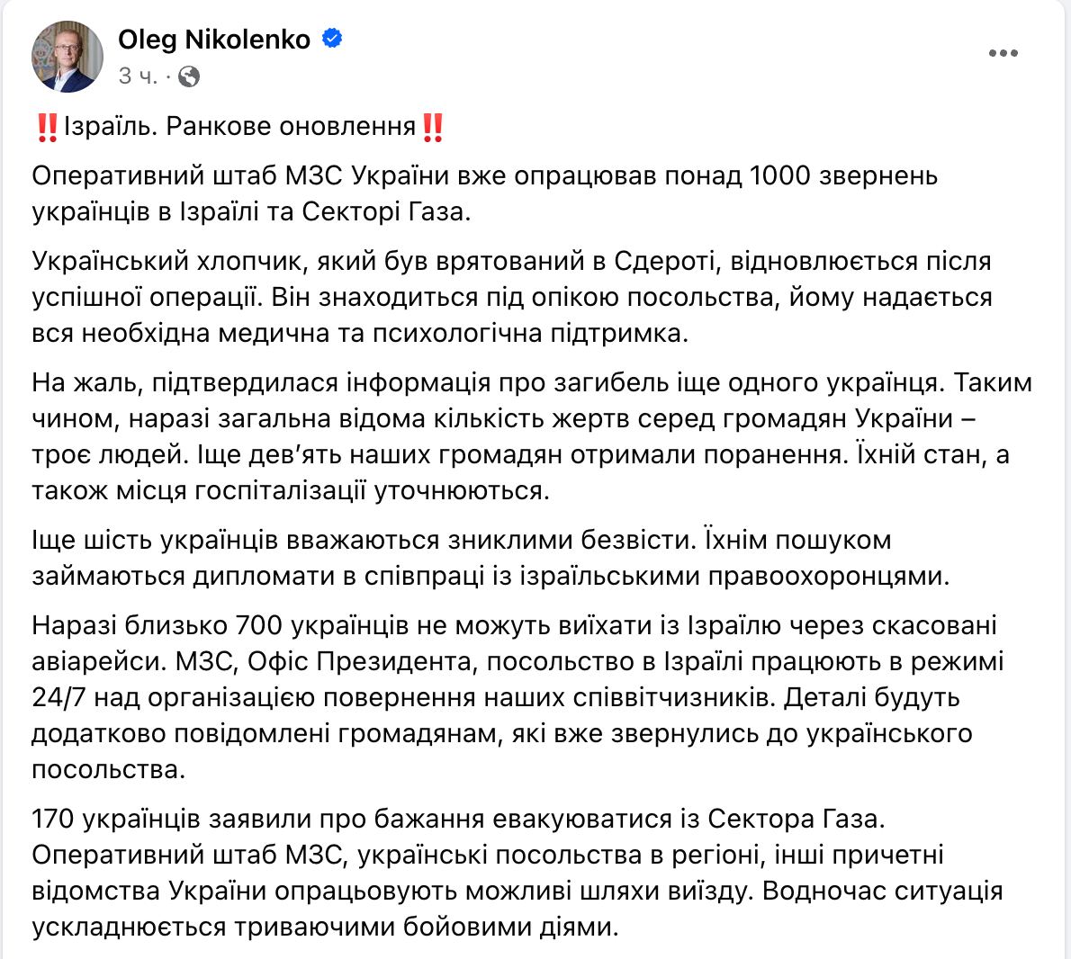 Между тем, по последним данным, в Израиле погибли три украинца, девять ранены, шесть считаются пропавшими без вести. Такую статистику приводит спикер украинского МИД Олег Николенко в Фейсбуке.