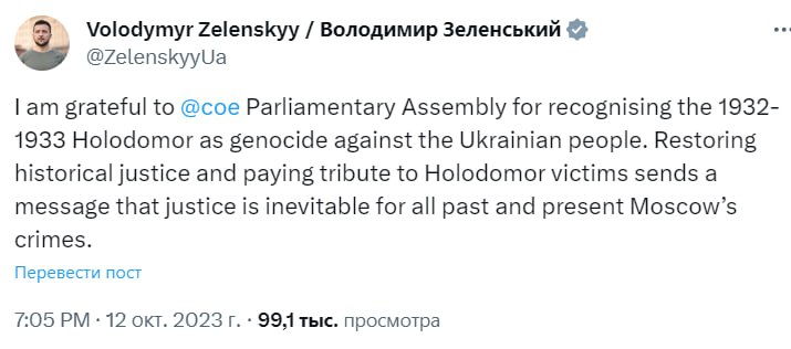 "Я благодарен ПАСЕ за признание Голодомора 1932-1933 годов геноцидом украинского народа. Восстановление исторической справедливости и памяти жертв Голодомора посылает четкий сигнал: справедливое наказание за все прошлые и нынешние преступления Москвы неизбежно", - сказано в посте.
