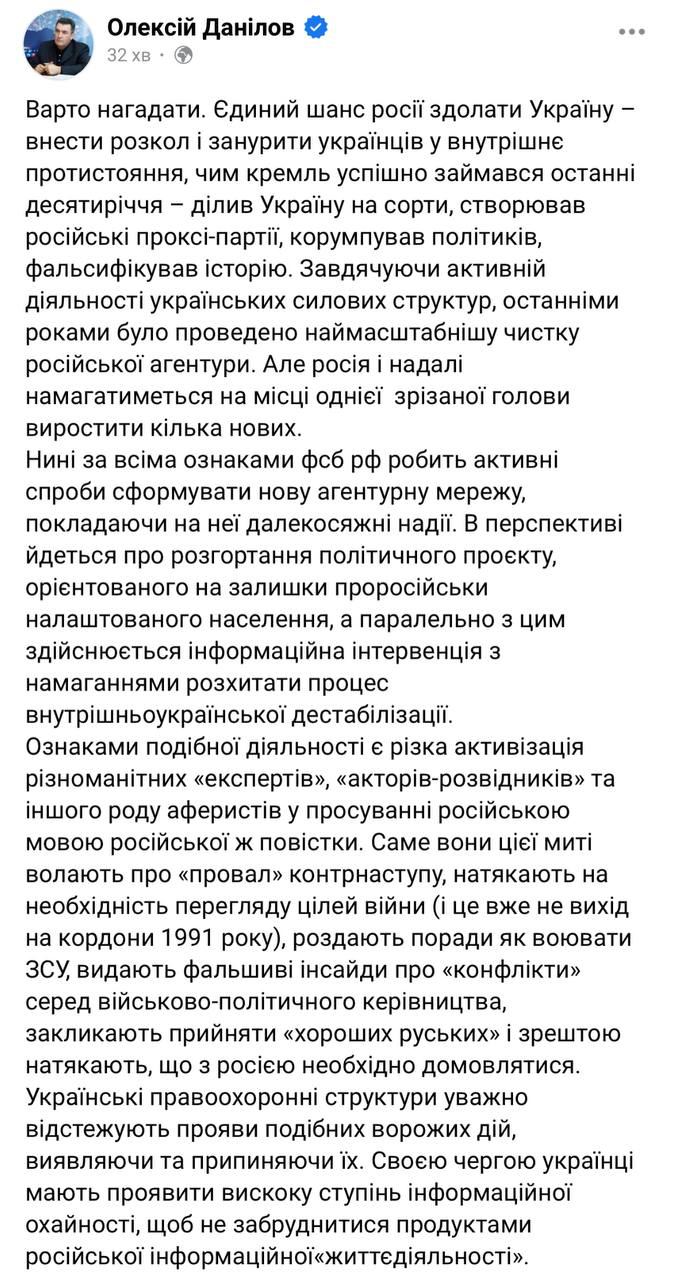 "Признаками подобной деятельности является резкая активизация разнообразных "экспертов", "актеров-разведчиков" и иного рода аферистов в продвижении на русском языке русской же повестки. Именно они в этот момент кричат о "провале" контрнаступления, намекают на необходимость пересмотра целей войны (и это уже не выход на границы 1991 года), раздают советы как воевать ВСУ, выдают фальшивые инсайды о "конфликтах" среди военно-политического руководства, призывают принять "хороших русских" и наконец намекают, что с россией необходимо договариваться", - пишет Данилов.