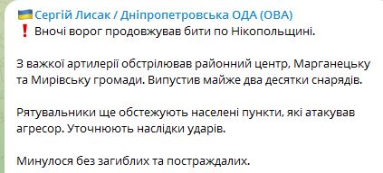 Ночью РФ выпустила около двух десятков снарядов по Днепропетровской области