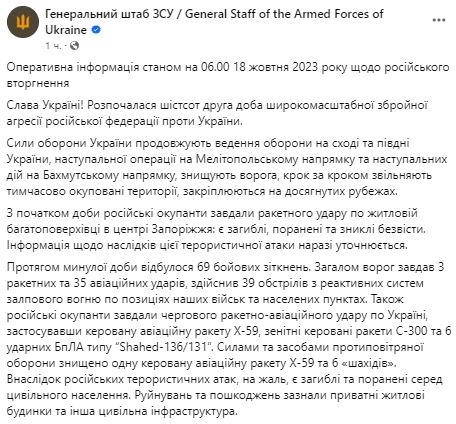 Утром 18 октября Генштаб ВСУ обнародовал сводку о ситуации на фронте.