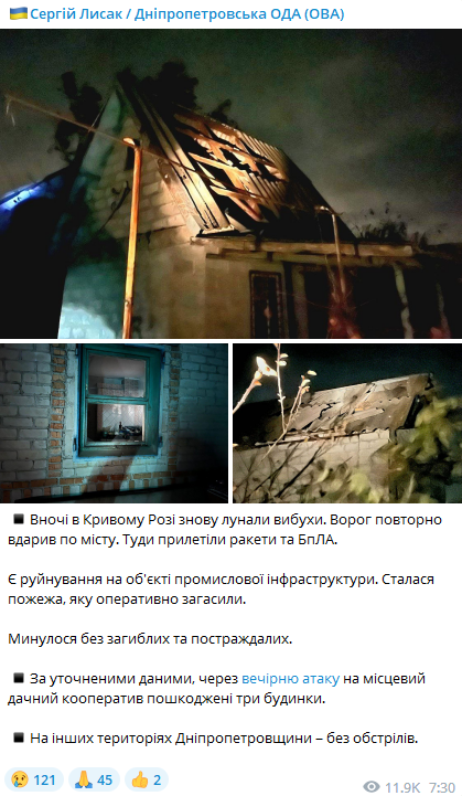Ночью, 21 октября российские военные повторно ударили с дронов-камикадз и ракет по Кривому Рогу.