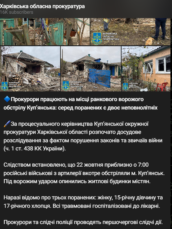 "22 октября примерно в 7:00 российские военные из артиллерии в очередной раз обстреляли г. Купянск. Под вражеским ударом оказались жилые дома горожан", - говорится в сообщении.