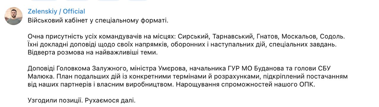 Докладывали главком Валерий Залужный, министр обороны Рустем Умеров, начальник ГУР Кирилл Буданов, глава СБУ Василий Малюк.