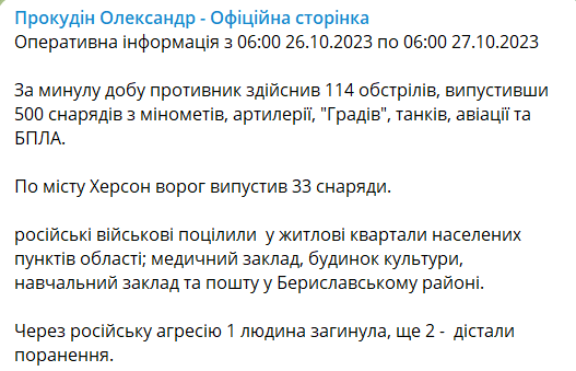 Россияне совершили 114 обстрелов Херсонской области за прошедшие сутки. Один человек погиб