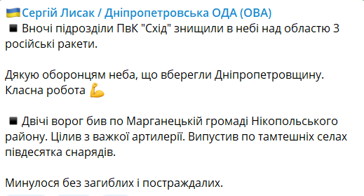 "Ночью подразделения ПВК "Восход" уничтожили в небе над областью 3 российские ракеты", - написал он.