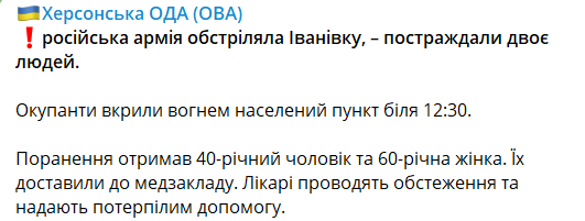 14:54 Сегодня днем российская армия обстреляла Ивановку Херсонской области. Пострадали два человека. Об этом сообщает ОВА.