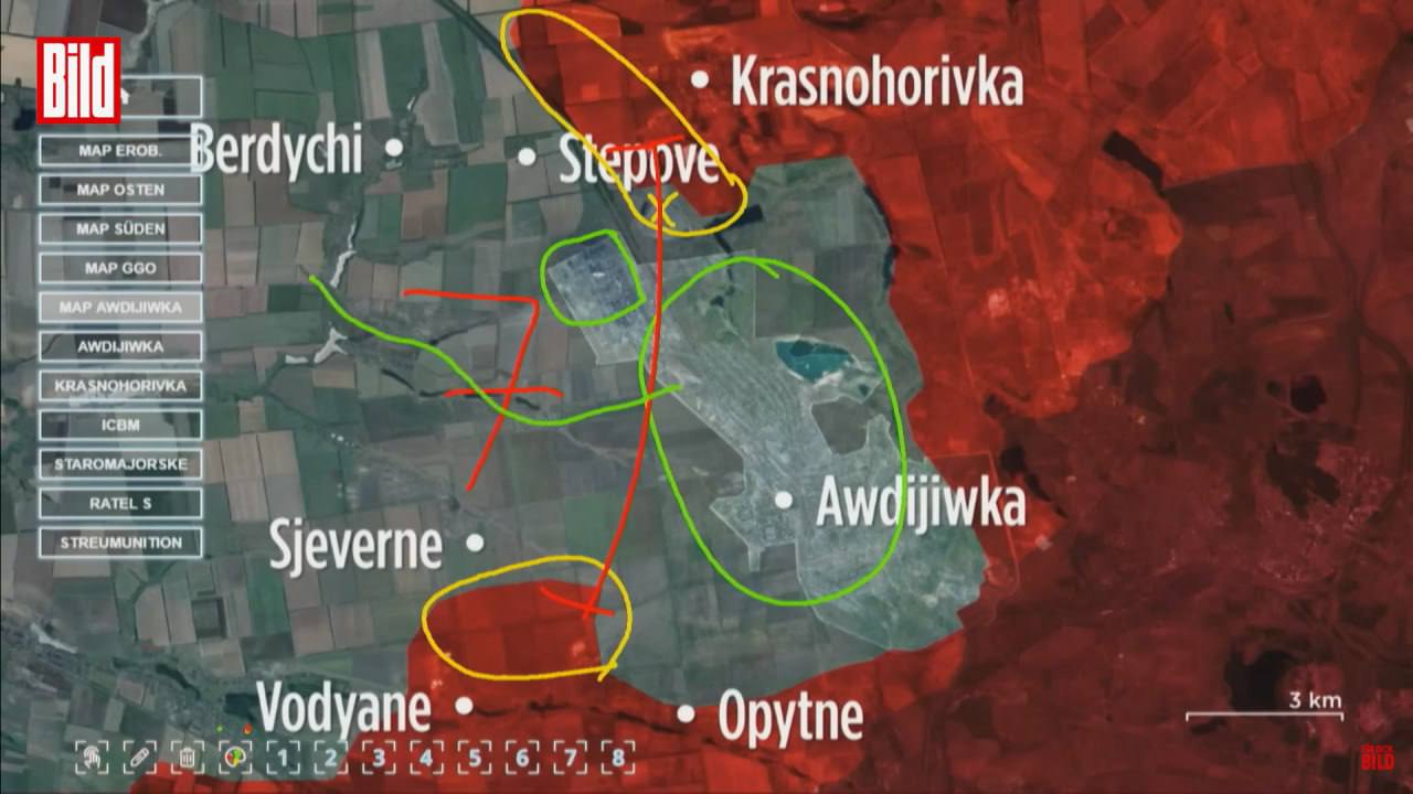 12:21 Авдеевка оказалась под угрозой окружения, считает военный эксперт BILD Юлиан Рёпке.