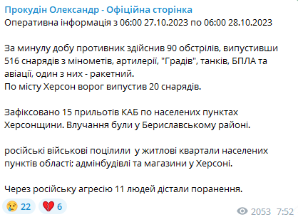 Также глава Херсонской ОВА Александр Прокудин сообщил, что за минувшие сутки россияне совершили 90 обстрелов, выпустив 516 снарядов из минометов, артиллерии, "Градов", танков, БПЛА и авиации, один из них – ракетный. По городу Херсон враг выпустил 20 снарядов.